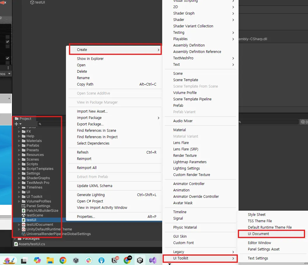 Project 우클릭 → Create → UI Toolkit → UI Document를 선택해서 새로운 UI Document를 생성합니다.