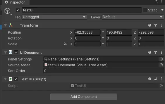 아래 사진처럼 UI Document에 Panel Settings와 TestUIDocument.uxml를 연결합니다.