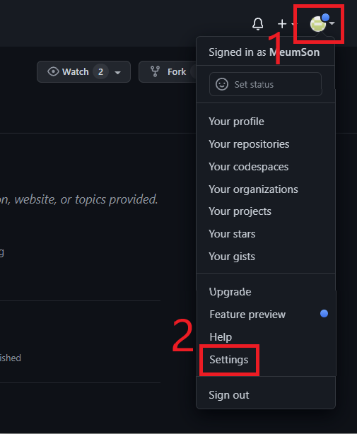 1. github 로그인 -> 우측 상단 프로필(원형 이미지) 클릭 -> Settings 클릭