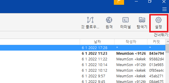 6. 소스트리 -> 우측 상단 설정(톱니 톱니) 버튼 클릭