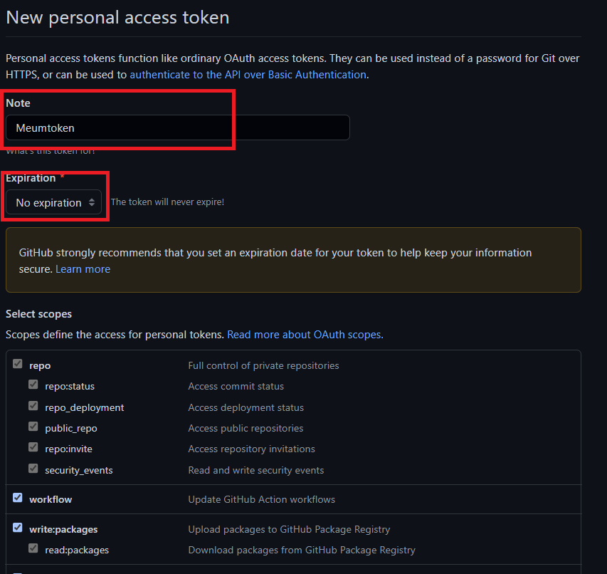 4. Note 부분에 생성할 token 이름 설정(자유!)