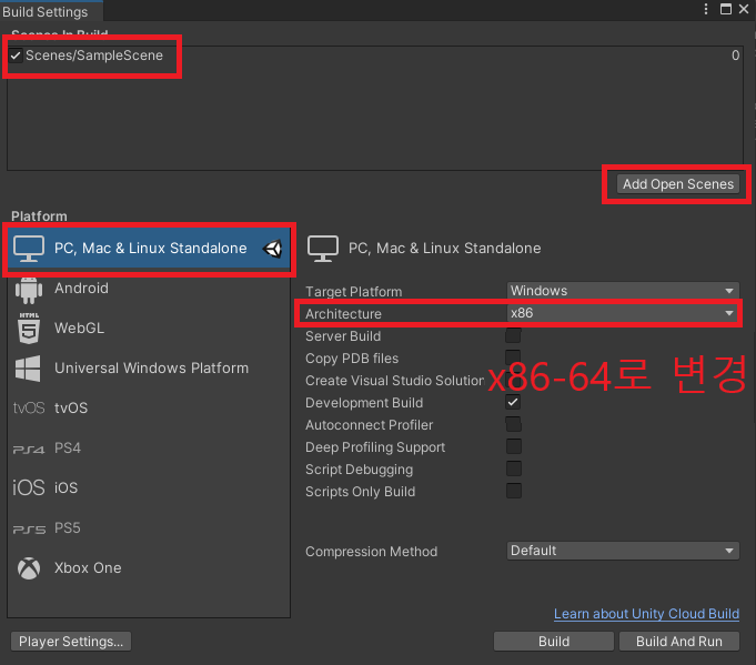 상단에 빌드를 원하는 씬이 보이지 않을 경우 Add Open Scenes 클릭